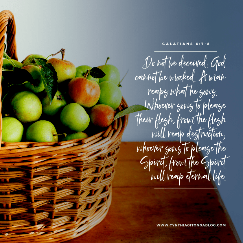 Memory Verse Galatians 6:7-8 “Do not be deceived: God cannot be mocked. A man reaps what he sows. Whoever sows to please their flesh, from the flesh will reap destruction; whoever sows to please the Spirit, from the Spirit will reap eternal life.”