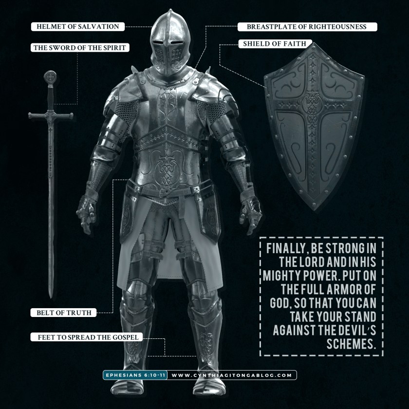 “Therefore put on the full armour of God, so that when the day of evil comes, you may be able to stand your ground, and after you have done everything, to stand. Stand firm then, with the belt of truth buckled round your waist, with the breastplate of righteousness in place, and with your feet fitted with the readiness that comes from the gospel of peace. In addition to all this, take up the shield of faith, with which you can extinguish all the flaming arrows of the evil one. Take the helmet of salvation and the sword of the Spirit which is the Word of God.” Truthfulness, righteousness, gospel of peace, faith, salvation and Word of God, these are the things that we should always have with us at all times, this is our armour!